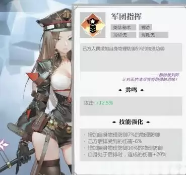 拉薇拉(军姬)第一大招群体加暴击爆伤,第一被动减怪防御,第二被动增加我方全体防御,两种被动不能同时存在