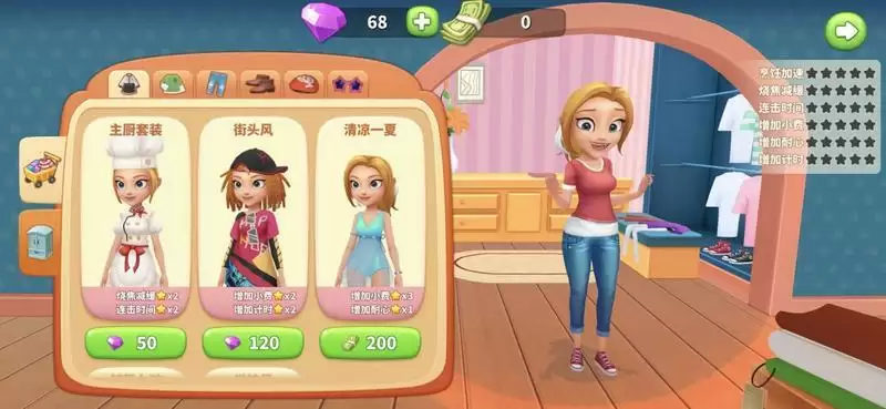 本座中的小姐姐花了我们非常多的心思,不仅可以做饭,还可以换装.每一套服装都可以对人物进行增强,得到更多的关卡结算奖励,或者降低游戏的难度.