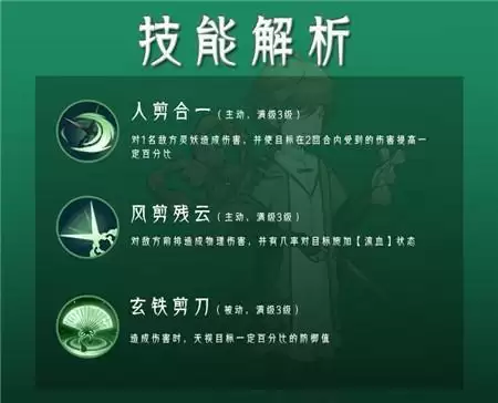 孟涂的1技能【人剪合一】可以对1名敌方灵妖造成伤害,并且在接下来的两个回合内,使目标受到的伤害提高一定的百分比;2技能【风卷残云】是对敌方前排3名灵妖造成伤害,并且有一定的几率对目标施加流血状态,被动技能【玄铁剪刀】则是在攻击时无视目标一定的防御值。
