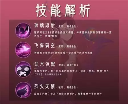 鸾的1技能【琉璃怒射】可以对随机的3名敌方灵妖造成法术伤害,并且在2个回合内使目标受到的伤害提高一定百分比,2技能【飞鸾裂空】是直接对敌方后排造成一定百分比的法术伤害。被动技能【法术沉默】在鸾每次行动都有几率触发,【烈火无情】则是对处于【灼烧】状态的敌方灵妖进行攻击时,伤害提升一定的百分比。