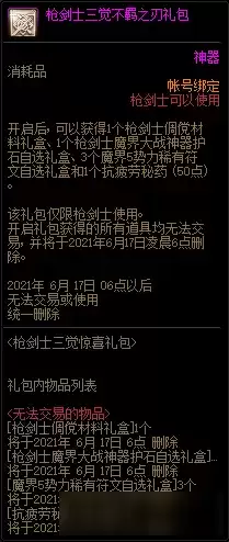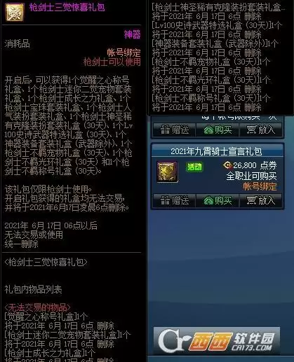 由于是枪剑士三觉版本,自然少不了枪剑士的相关礼包。本次将上架1088点券的三觉不羁之刃礼盒以及3666点券的三觉惊喜礼盒,这里提醒玩家,礼包中的部分道具具有30天的期限,玩家购买前千万看清楚了。