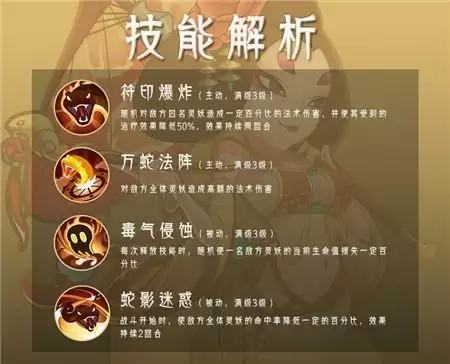 腾蛇的两个主动技能都是范围伤害技能,她的一技能【符印爆炸】可以对四名随机的敌方灵妖造成一定百分比的法术伤害,并且可以将目标受到的治疗效果降低50%;二技能【万蛇法阵】则是对敌方全体灵妖造成高额的法术伤害。