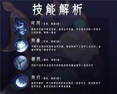 被动技能【御风】是攻击处于诅咒状态的地方灵妖,造成的伤害会增加,【风刃】则是在风伯造成伤害时,有几率使目标的攻击降低,并且当目标处于诅咒状态时,降低攻击力的几率会大大增加。