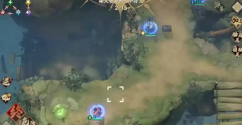 冰璃飞刺+连斩第一回合解决左边符咒,古伦德直接技能秒掉3个蓝色小怪,封铃笙先走,攻击蓝色小怪,璇玑用技能打,然后会传送到蘑菇上面,直接消灭掉左下的符怪
