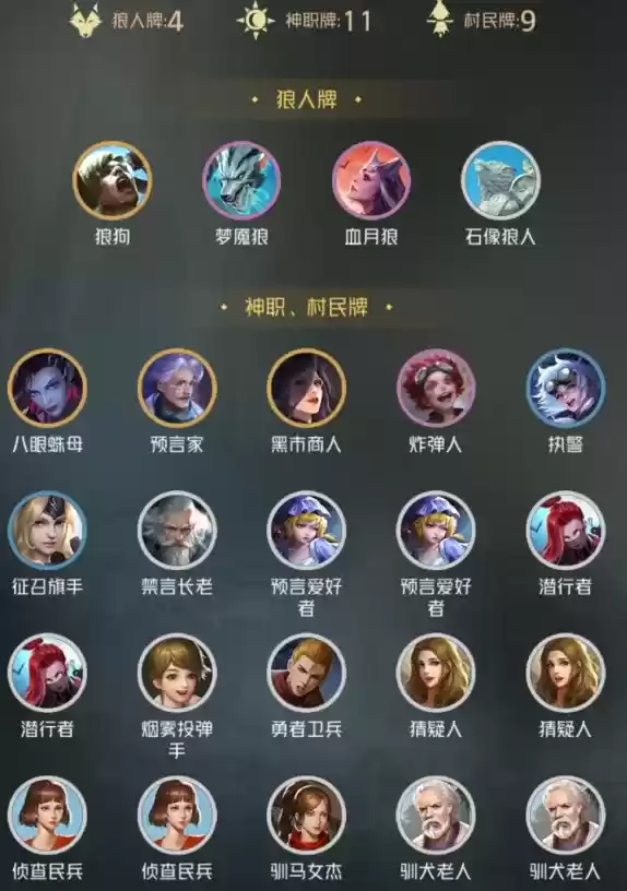 起手找三幻神中的预言爱好者和猜疑人、征召、主母。狼人起手几乎都可以留,打法保险一点不留狼狗。先手有征召优先用征召,场面交换力争第二天八打七。先手没有征召优先考虑技能探。后手征召不是很划算,除非对面开个2血怪,否则交换优势在对面手中,如果对面开个三血怪,就预言爱好者和猜疑人,第一天二回合优先交换场面别急着探,第一天探了也没有用,拉出卡差为后面探卡取得优势。