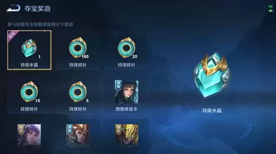 本次玲珑夺宝上线,召唤师通过玲珑夺宝可随机获得以下奖励之一:玲珑水晶、玲珑碎片、西施体验卡(3日)、归虚梦演体验卡(3日)、杨戬体验卡(3日)、埃及法老体验卡(3日)。