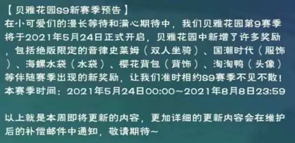 在小可爱们的漫长等待和满心期待中,我们贝雅花园第9赛季将于2021年5月24日正式开启,贝雅花园中新增了许多奖励,包括绝版限定的音律史莱姆(双人坐骑)、国潮时代(服饰)、海螺水袋(水袋)、樱花背包(背饰)、淘淘鸭(头像)等伴随赛季出现的新奖励,让我们准时相约S9赛季不见不散!