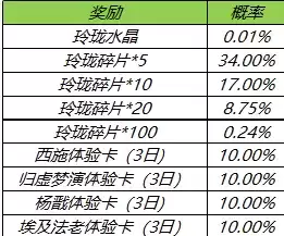 本次玲珑夺宝上线,召唤师通过玲珑夺宝可随机获得以下奖励之一:玲珑水晶、玲珑碎片、西施体验卡(3日)、归虚梦演体验卡(3日)、杨戬体验卡(3日)、埃及法老体验卡(3日)。