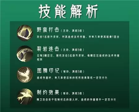 因为精卫常常和大鸟一起拿石头去填海,所以她的技能也和石头有关。1技能【野蛮打击】的效果为攻击一名灵妖,并有几率使其眩晕一回合。2技能【裂岩连击】则是连续召唤3颗巨石对3名敌方灵妖造成伤害,且每颗石头造成的伤害都相同。此外她的被动除了增伤之外,还会进一步减低敌人对控制的抵抗效果。