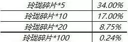2、获得玲珑碎片的概率为34.5%5个碎片、17%10个玲珑碎片、8.75%20个玲珑碎片、0.24%100个玲珑碎片。
