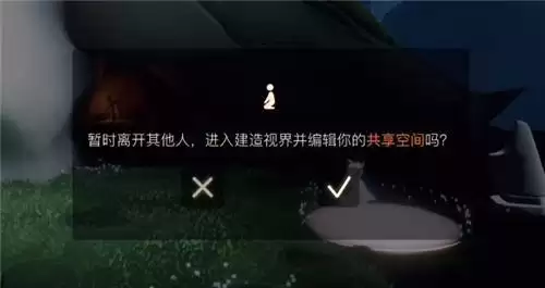来到石像前的空地,就会出现一个光圈,点击那个打坐功能,就会弹出如下窗口提示“展示离开其他人,进入建造视界并编辑你的共享空间吗?”