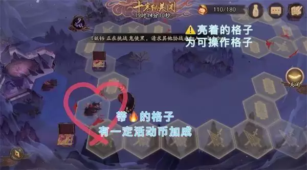 亮着的格子为可作战区域,格子有三种情况:小怪、捐赠&委派