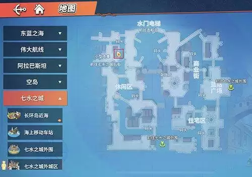 这个位置还是比较难找到到的,因为在地图上并没有直接标注这个餐厅,需要玩家来到七水之城外城区地图的左上角这里,就是在码头、小型集市的这个地方,如图所示。