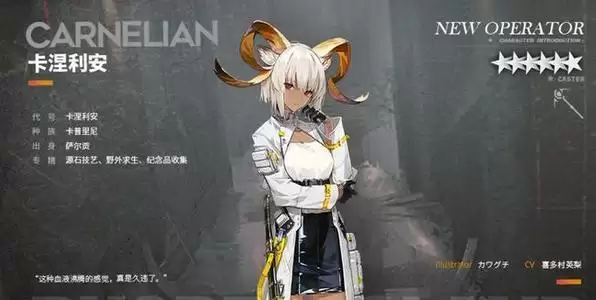 卡涅利安,出身萨尔贡深处不受王酋管辖的某个古老部族,目前外出游学中。因接受莱塔尼亚霍恩洛厄伯爵的雇佣,作为其侍从长期停留于莱塔尼亚地区。现与罗德岛达成合作关系,作为干员为罗德岛执行莱塔尼亚境内的相关任务。