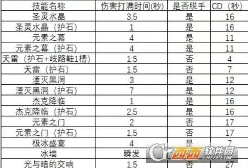元素这个职业CD特别快,没有真空期的存在(搭配魔杖、暗杀者套装),技能多为脱手技能,但是大多数技能需要打满伤害需要一定时间,下面笔者整理了一份大概的时间表格(14.5%冷却时间减少以及暗杀者套装,魔杖,以及21年新春宠物,精确到0.5s)。