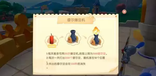 10、摩尔豆爆豆机:在摩尔城堡的二楼找到摩尔豆爆豆机,使用爆豆机放入之后炸出摩尔豆,随机掉落在地上10个位置,显示120秒。