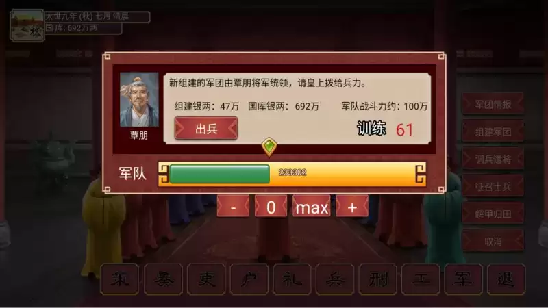 兵部的作用主要是能够观看关于军队方面的情况下,能够更改我们的军团名字以及帮助军团的人数进行扩充。