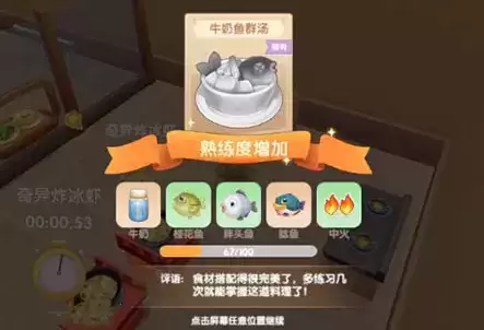 做牛奶鱼群汤推荐使用【中火】,这样一次可以增加65%,也就是做两次就可以顺利解锁食谱了,使用大火和小火的话据说也可以,但是成功率貌似偏低,所以不是很推荐大家使用。