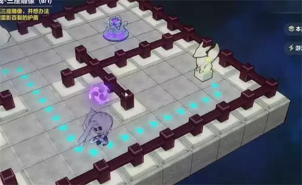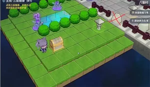 第二第三座神像我们用图中的雷元素即可挨个点亮,路上的石头可以点路灯切换位置。三座神像全部点亮后,图中小人面前的三块石头会消失,宝箱也可以拿到了。月轮会在后面出现,和她旁边的充电桩互动即可解除她身上的护盾,到此本层的剧情就走完了。