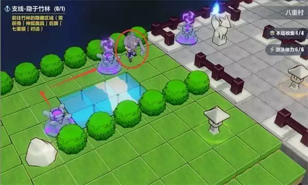 砍掉竹子可以拿一个宝箱,沿箭头走顺路和神像遗迹守卫都互动一下,神像说的话就是灯笼的互动顺序,这里直接标出来了。
