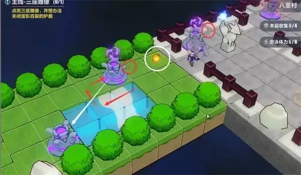 接下来是本关是树莓和全收集,刚刚点亮全部神像后顺带就把雷元素放在图中1号充电桩处,打开左边的区域。(1号和2号的命名我们稍后会用到)树莓别忘了,拿取2号充电桩上的雷元素需要注意按照图中红色箭头走,不能带着雷元素下水,否则会重来。