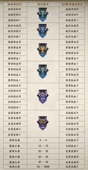 然后就是表格继承规则,左边一列是赛季结束时玩家当时所在的段位,右边一列是新赛季玩家会对应继承到的段位。