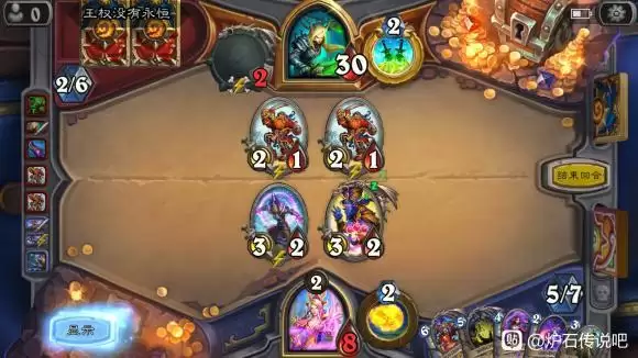 看排序,不过有几个技巧,选打2的技能打剧毒,然后小狂乱尽量留给对面的57嘲讽打对面的剧毒或者提前把57打到2血,剽亡语,这样资源会多2个57,再就是看牌序了。