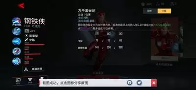 钢铁侠向指定方向发射激光炮,对激光路径上的敌人每0.3秒造成140(+40%能量强度)点能量伤害,最多造成10次伤害。