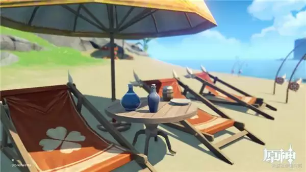 沙滩椅在阴影下有微微的海风吹过,旁边桌子上放着两瓶酒