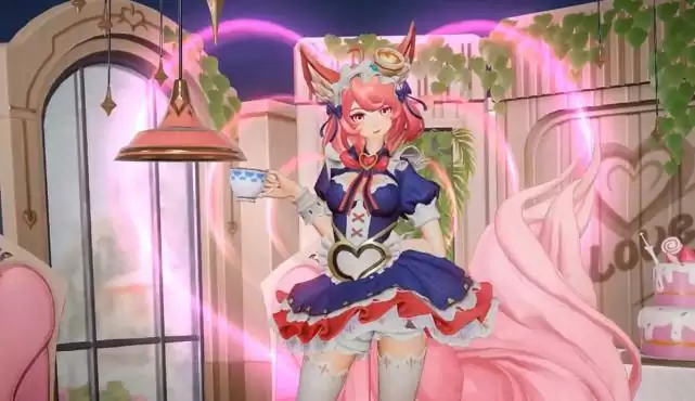 紧接着妲己就好像是美少女变身似的,穿着女仆制服,一个旋转身体,身后还有很多音乐符号出现,旁边还有很多小圆圈在一闪一闪的,而妲己的尾巴也跟随着妲己在挥舞旋转,非常柔软。