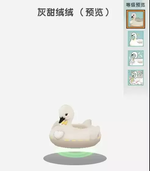 3、随着等级的提升,它的形状也逐渐变大。升级到最高等级四级的曦光绘梦之后,天鹅自头上戴着浅蓝色的蝴蝶结、细长的脖子上系着特有的徽章,底部环绕着蓝色水的特效,空中飘落白色的羽毛、天鹅身上不断散发出粉色爱心的特效,本兔的少女心也随之荡漾!