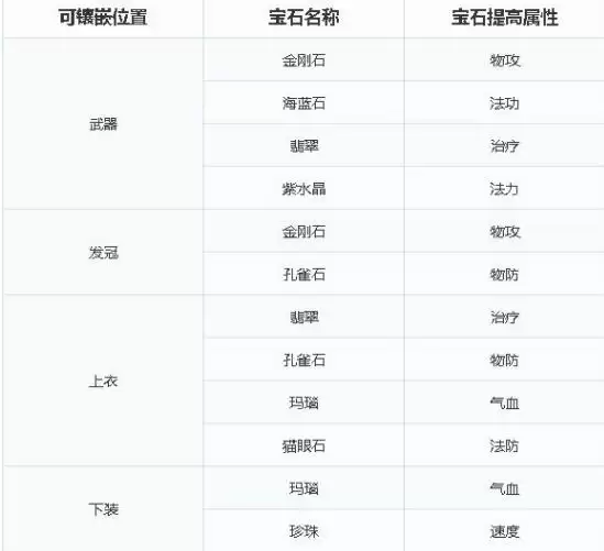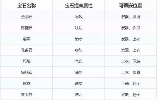 目前游戏内一共有8种宝石,它们分别是金刚石、海蓝石、翡翠、孔雀石、玛瑙、猫眼石、珍珠、紫水晶,其中并没有提高封印强化的宝石。人物装备一共6个部位,它们分别是武器、发冠、上衣、下装、饰品、鞋子。而每个部位能镶嵌的宝石也是有所区别的,具体如下图所示: