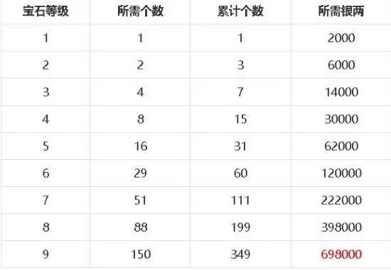 以下银两消耗仅计算每个宝石的最初价格2000银子/个,随着人物等级提升,宝石的价格会越来越高,1个宝石升到9级需要将近70万银子,具体升级所需个数和银两如下表: