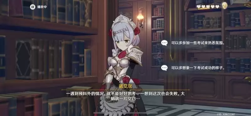 这里选择“换个地方缓解一下紧张感吧。”则会进入分叉点2,选择“不要逃避,直面考试的压力吧!”则会进入分叉点3。