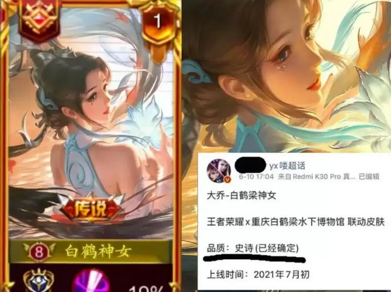从放出的消息能得出这款皮肤将在七月三号正式上线,目前这款皮肤的品质也已经确定,非常遗憾白鹤梁神女并没有成为大家心目中的传说皮肤,其实主要碍于大乔的技能机制,众所周知,传说品质和史诗品质的差距无非就是在回城特效和局内移动特效上,而大乔的“电梯”也注定了她不能成为一款传说皮肤。