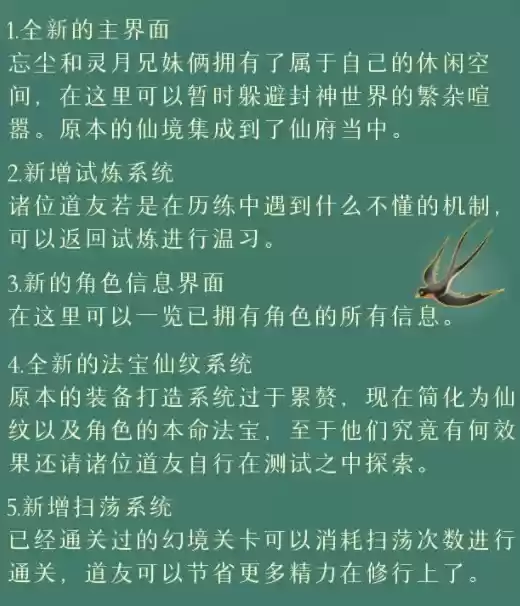 原本的装备打造系统过于累赘,现在简化为仙纹以及角色的本命法宝,至于他们究竟有何效果还请诸位道友自行在测试之中探索。