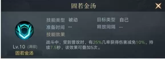 这个成语主公们想必都不陌生,经常被用来形容城池的阵地非常坚固,经常和易守难攻这类词汇用在一起。所以曹仁的这个技能即使不看效果想必大家也都看出来了这个主T的神技。