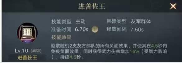 可以看到该技能能够驱散友方部队身上的所有负面效果,并且驱散之后还有一定的时间免疫负面效果,在遇到依靠负面效果打输出的谋攻队时可以说是直接废了对方一半的输出能力。