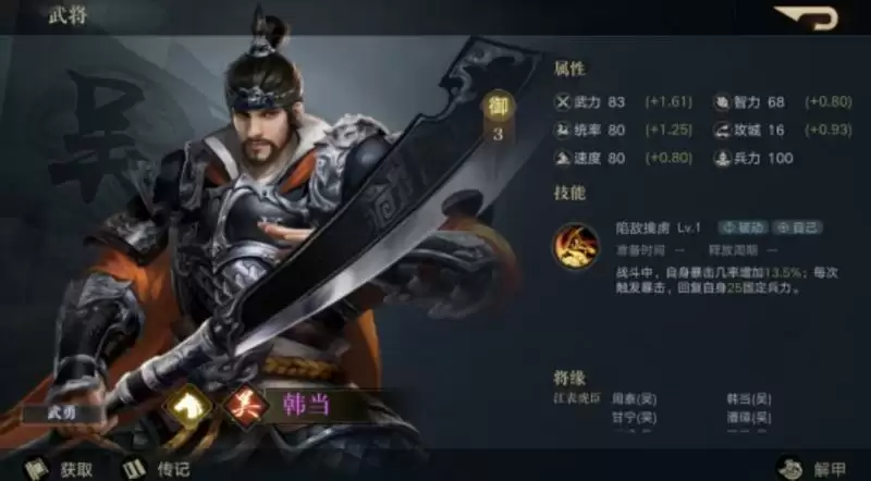 荣耀新三国手游韩当怎么样?这是一个很受欢迎的英雄,很多小伙伴想要知道他厉不厉害,值得培养吗?下面是小编给大家带来的《荣耀新三国》手游韩当技能属性立绘图鉴分享,一起看看吧!