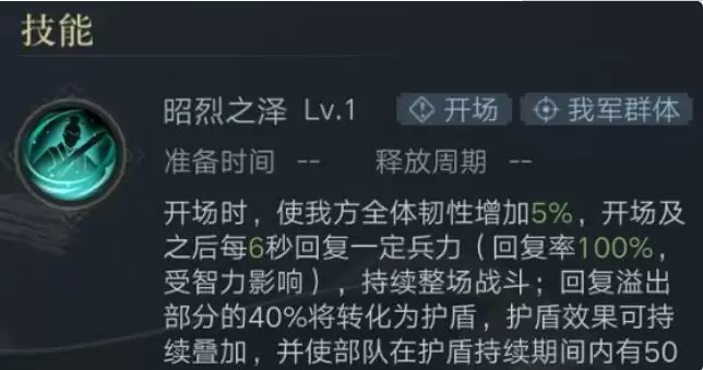 御值6御,技能特性为增加全体韧性,每6秒回复兵力含开场并溢出部分的40%转换为护盾,且有50%几率免疫控制(1级技能属性)。这四项技能关键词,可见刘备的人权属性,不管是开荒还是打架,都是极其有用。护盾针对开荒,免疫控制针对PVP。