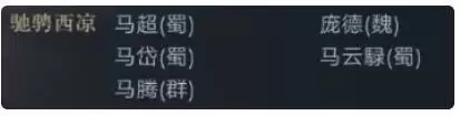 马超、庞德、马岱、马腾、马云騄。这里就不得不说的是当时威风凛凛的西凉铁骑了,正如这十二字的评价:日行数百,来如风雨,去如绝弦。这也能说明,当时西凉铁骑的厉害。