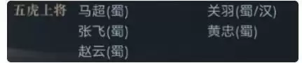 马超、关羽、张飞、黄忠、赵云。五虎上将最早出现在《三国志》中,虽然作者陈寿并没有提出这个概念,只是将五位虎将并列合为一传。但是,这也能看出作者陈寿对五位做出贡献的认同。