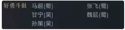 马超、张飞、甘宁、魏延、孙策。以上五位都是以勇猛著称。本期主角马超就自不必说了。其余几个也都是能征善战、勇猛无敌之辈。比如,张飞的当阳喝敌;比如,甘宁仅凭百骑,就能劫曹操40万军队大营。
