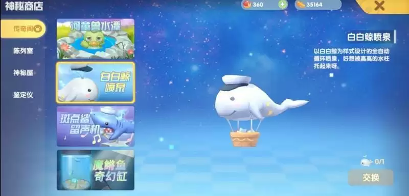 传说鱼可以在爱心广场警察署旁边的大力处兑换物品。点开大力,查看神秘商店-传奇阁就可以兑换了,目前可以兑换家具有:河童水潭,白白鲸喷泉,斑点鲨留声机,魔鳉鱼作奇幻缸等。