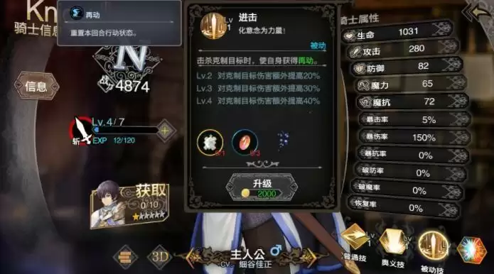 男主,斧头职业的克星,有高倍率对斧伤害,5星还可以选择自回SP,在三保二阵容中作为第二输出可以在没有女仆充能的情况下更快打出第二发大招,缺点就是在对其他职业倍率较低,新手平民玩家推荐练,因为他可以靠刷新商店快速6星,前期靠高星的属性在各个关卡使用效果还是不错。推荐套装:攻击2件套 暴击2件套 爆伤2件套 常见的套装搭配可以让他装备在其他主力成型进行更换。