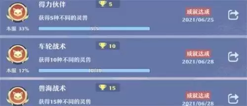 (4)【灵兽】,获得不同灵兽的3个成就很好完成,直接用铜钱去集市买,把各等级你没有获得过的买一下就有15种了。