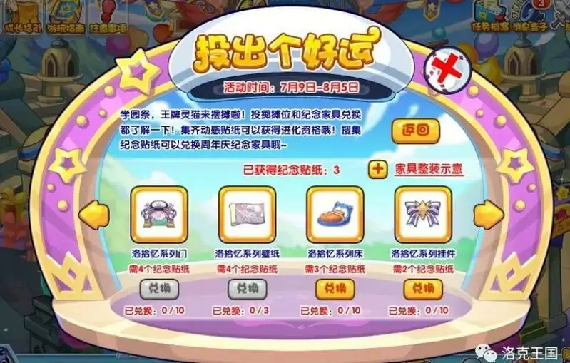 洛克王国十一周年庆期间,洛拾忆系列家具可以通过纪念贴纸兑换。全套洛拾忆系列家具包含:洛抬忆系列门、洛拾忆系列壁纸、洛拾忆系列床、洛拾忆系列挂件、洛拾忆系列地毯、洛拾忆系列桌子、洛拾忆系列椅子、洛拾忆系列地板,其中桌子的兑换最贵,需要6个贴纸,上限两个。