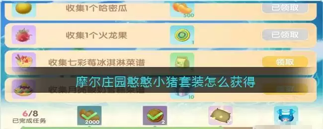 在夏日版本中开启了全新的收集活动,玩家们通过收集不同的农作物,鱼种和食物就可以完成任务获得奖励。想要获得憨憨小猪套装的话需要将收集任务中的全部道具收集齐,共有八个任务。