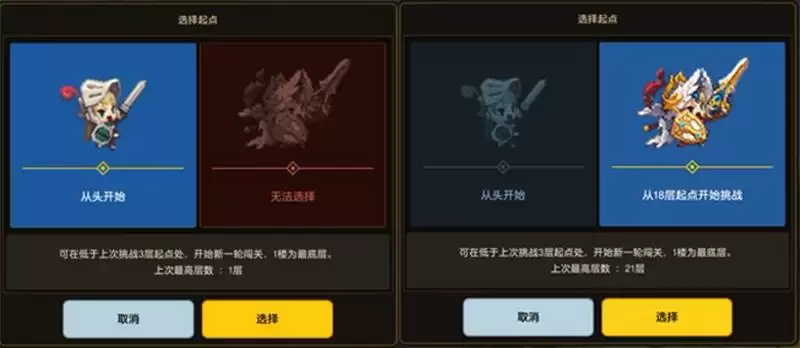 3、达到一定楼层,玩家可选择【挑战结束】,终止挑战进入结算页面(终止挑战后,将会重置英雄生命值)。系统会为您自动记录本次挑战的进度:如您本次挑战最高记录在3层及以下时,下次挑战需【从头开始】;如您本次挑战最高记录在3层以上时,下次挑战可选择【低于上次挑战3层起点处】开始新一轮闯关或者选择【从头开始】。