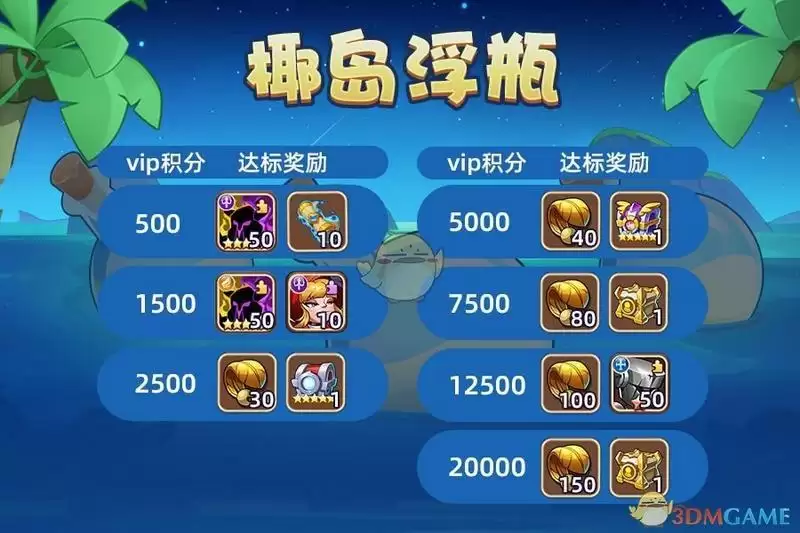 在椰岛浮瓶活动期间,累积获得VIP积分达到指定数额,即可获得丰厚奖励!比如精英光/暗5星碎片、辉煌圣物、四系/光暗/辉煌神器自选箱、傀儡等,详情如图: